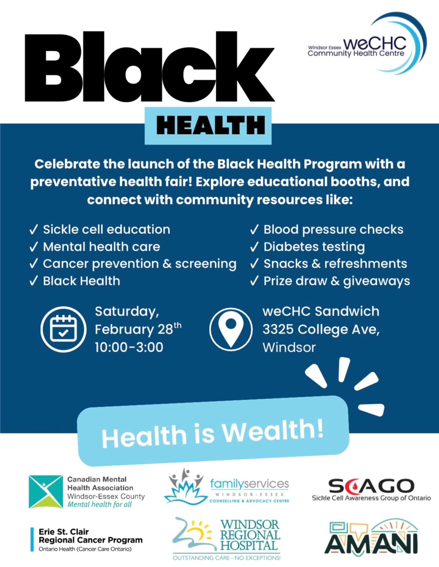 Celebrate the launch of the Black Health Program with a preventative health fair! Explore educational booths, and connect with community resources like: Where: weCHC Sandwich – 3325 College Ave, Windsor […]