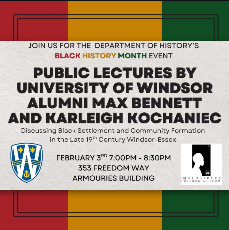 Join the University of Windsor Department of History and the Amherstburg Freedom Museum for a Black History Month featuring alumni Max Bennett and Karleigh Kochaniec. Bennett and Kochaniec will discuss their past research and knowledge mobilization activities as Local Black History Interns at the Amherstburg Freedom Museum. This free event takes place at the School […]